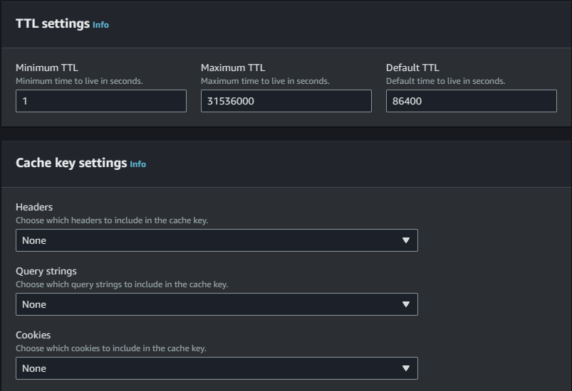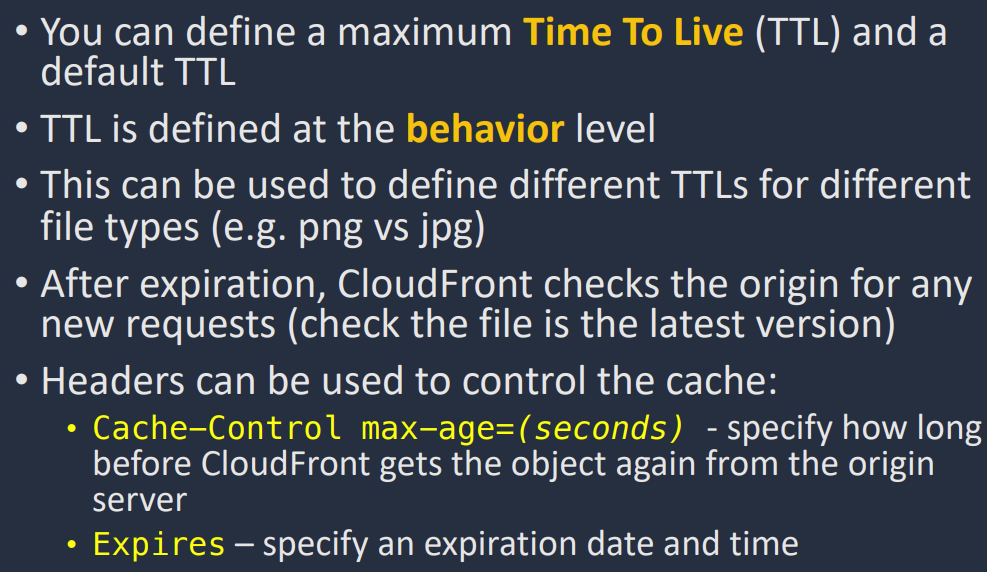 Cache Policy cũng bao gồm TTL (0s tới 1 năm), có thể set bởi Origin bằng cách sử dụng header Cache-Control, Expires…