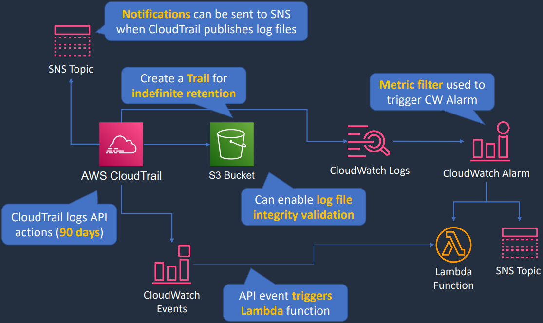 CloudTrail Lưu log toàn bộ API được gọi (bất kỳ qua API hay Console, SDK…), mặc định là 90 ngày, trường hợp muốn lưu lâu hơn cần export tới S3, sau đó dùng Athena để query từ S3.